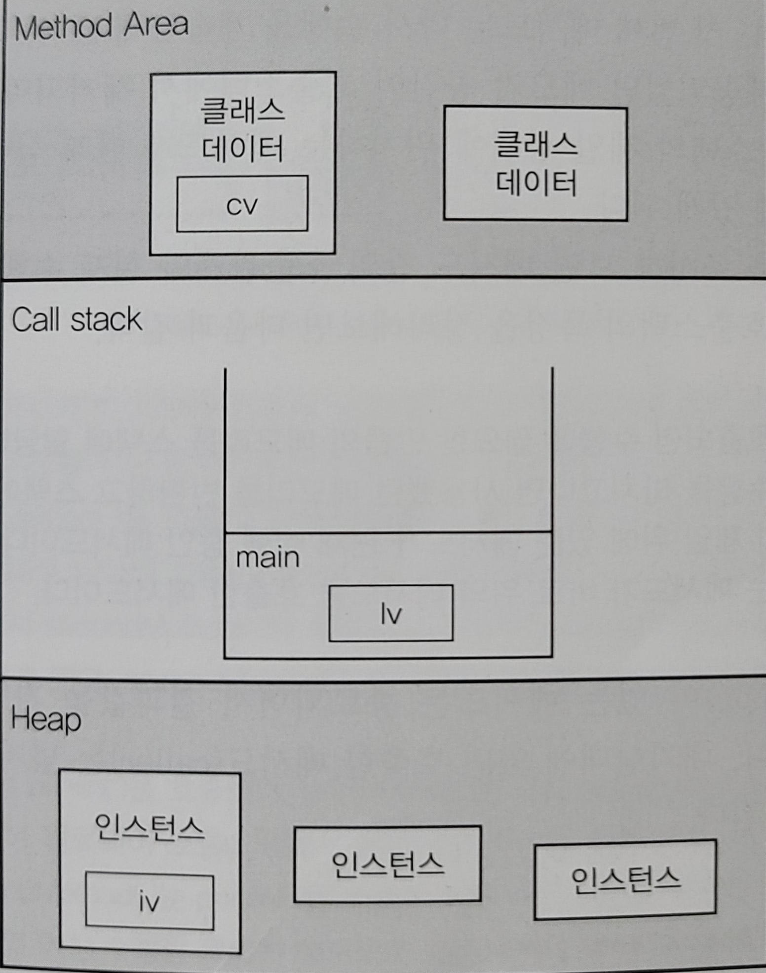 - 프로그램 실행 중 어떤 클래스가 사용되면, JVM은 해당 크래스의 클래스파일(*.class)을 읽어서 분석하여 클래스에 대한 정보를 이곳에 저장한다. 이 때, 그 클래스의 클래스변수도 이 영역에 함께 생성된다.