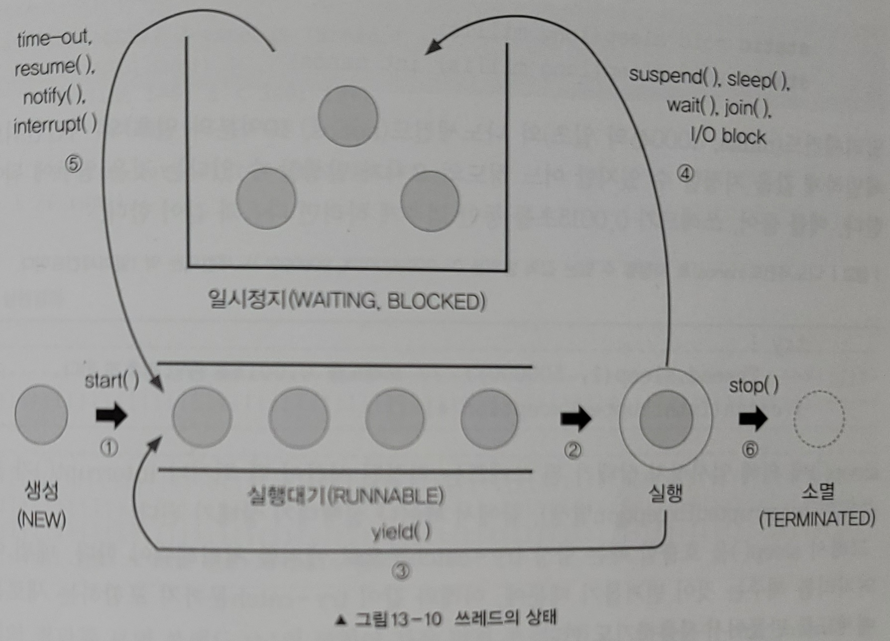- 실행을 모두 마치거나 stop()이 호출되면 쓰레드는 소멸.