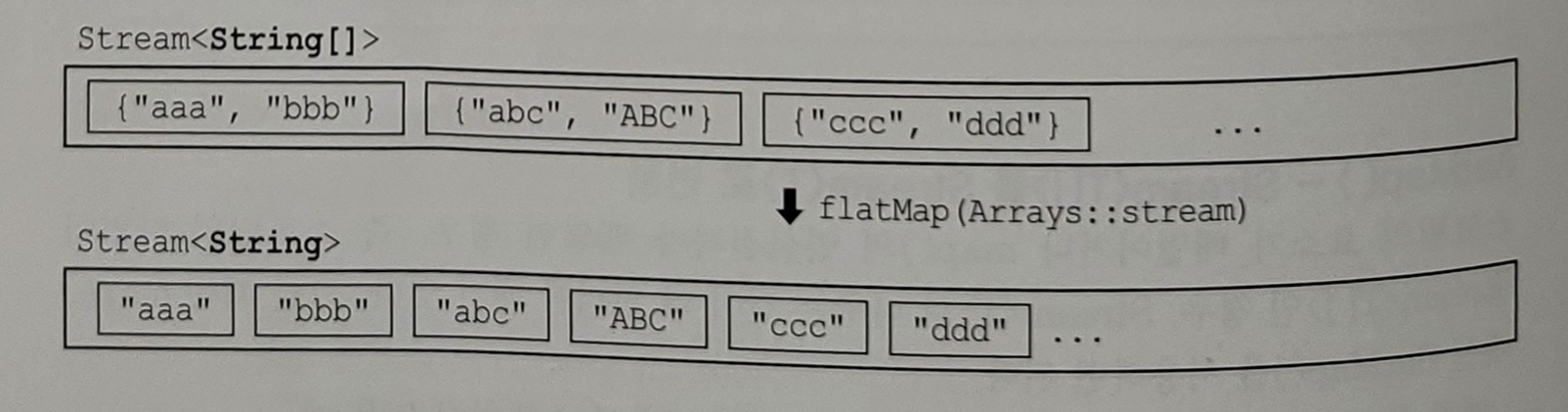 Stream<string[]>을 'flatmap(Arrays:stream)' 변환한 결과는 Stream<String>이 된다.