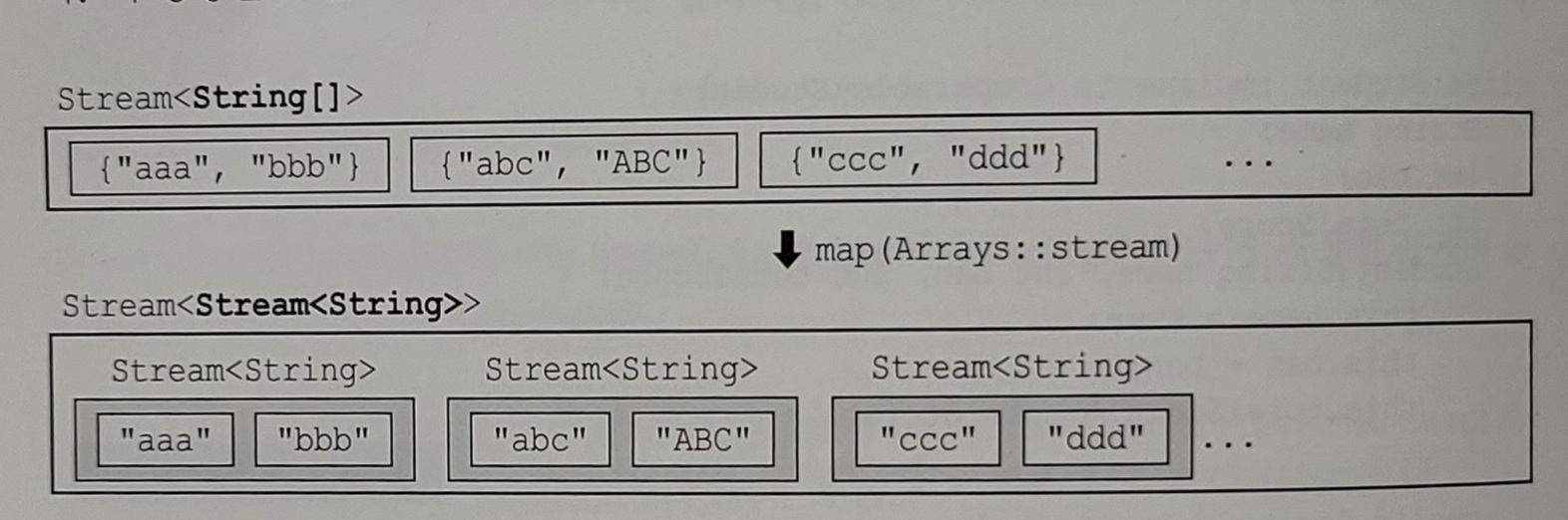 Stream<String[]>을 'map(Arrays:stream)' 변환한 결과는 Stream<Stream<String>>이 된다.