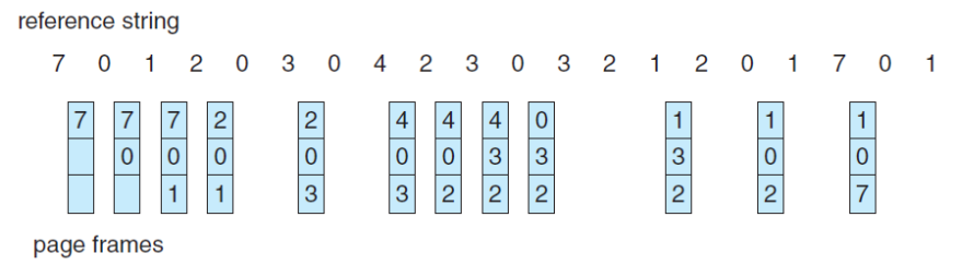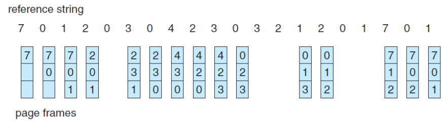 FIFO (First-In, First-Out) Page Replacement FIFO는 가장 단순한 페이지 교체 알고리즘으로, 메모리에 옮겨진 메모리들 중 가장 오래된 페이지를 Victim으로 선택한다. 각 페이지가 메모리로 옮겨진 시간을 직