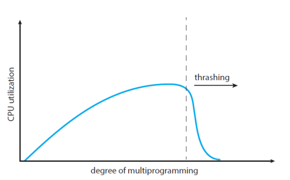 - 프로세스가 page in,out에대해서 바쁠때, 멀티프로그래밍 사용이 높아지면 높아질수록 cpu 사용량이 많아져야하는데, 일정부분 이상부턴 더 떨어짐
