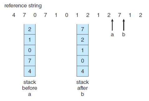 - 들어오는 페이지들을 stack에 쌓아두다가, stack에 있는 페이지가 들어오면 기존에 있던걸 빼고 새로 위에 쌓는다.