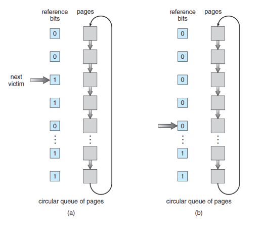- 참조비트(reference bit): 초기값 0. 페이지가 참조되면 1로, 교체되어 나가면 0으로 설정하는 비트.