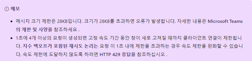 팀즈 훅은 api 요청 속도 제한이랑 요청 크기 제한이 있다..!