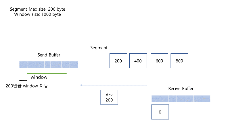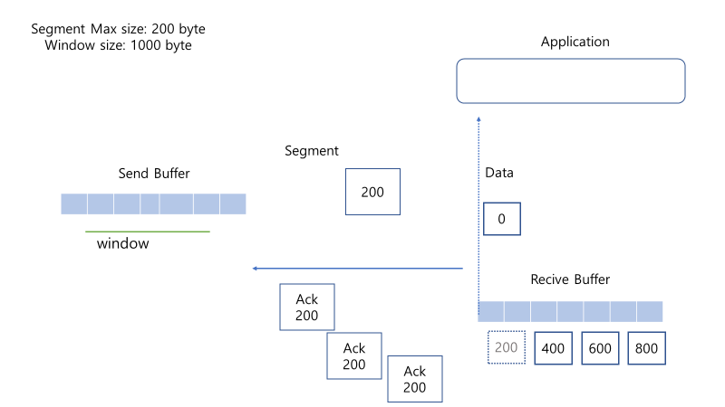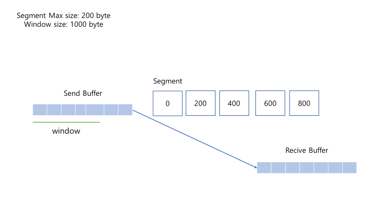 예를 들어, 윈도우 사이즈가 1000이고, Send Buffer에 그만큼의 데이터가 쌓여있다면, 0~999까지의 데이터가 전송된다. 이때 데이터는 세그먼트 단위로 전송되어지는데, 최대 세그먼트 크기가 200byte라고 가정하면,