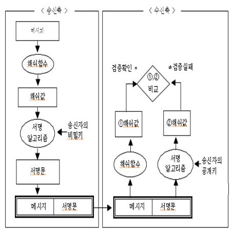 I. 공개키 기반, 전자서명의 개요 가. 전자서명의 정의 송신자의 개인키로 암호화한 메시지를 수신자가 송신자의 공개키로 복호화하여 검증하는 송신자 신원 증명 기술 나. 전자서명의 조건 조