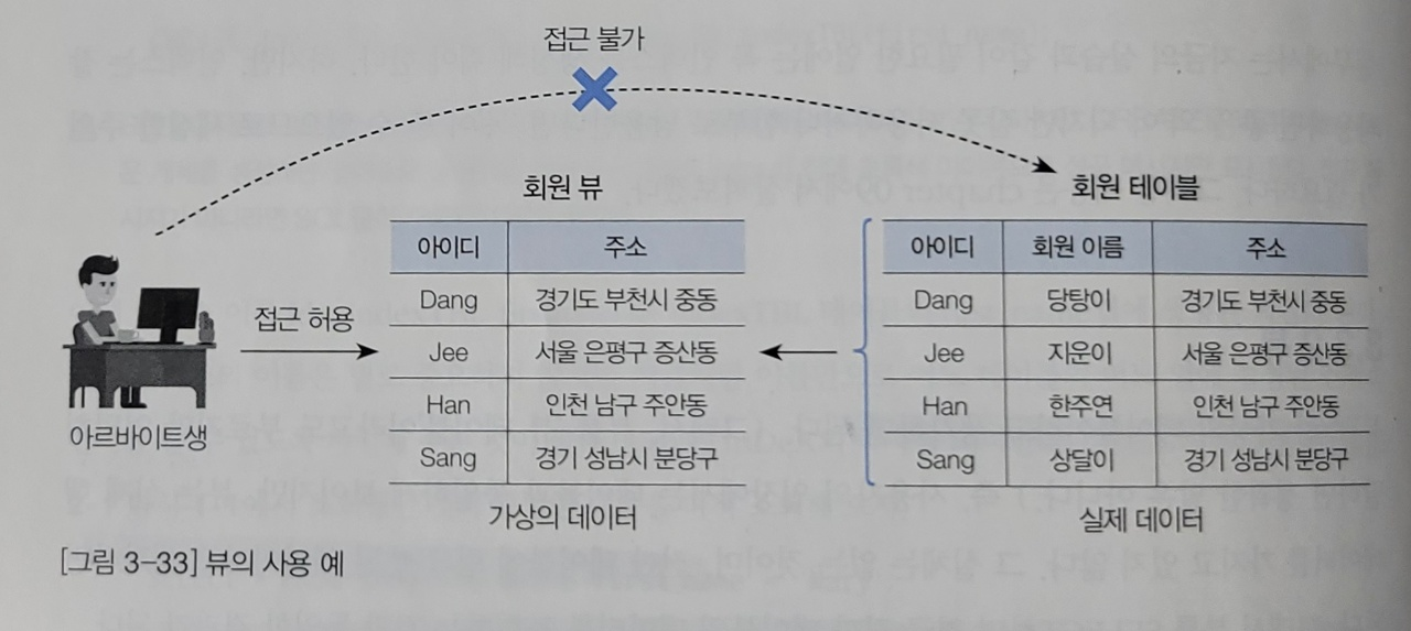 - 원본 테이블에서 사용자에게 보여줄 데이터만을 가지고 뷰를 만들고 이에 대한 접근 권한만 줌으로서, 사용자에게 중요 정보들은 보여지지 않고 접근하지 못하게 할 수 있다.